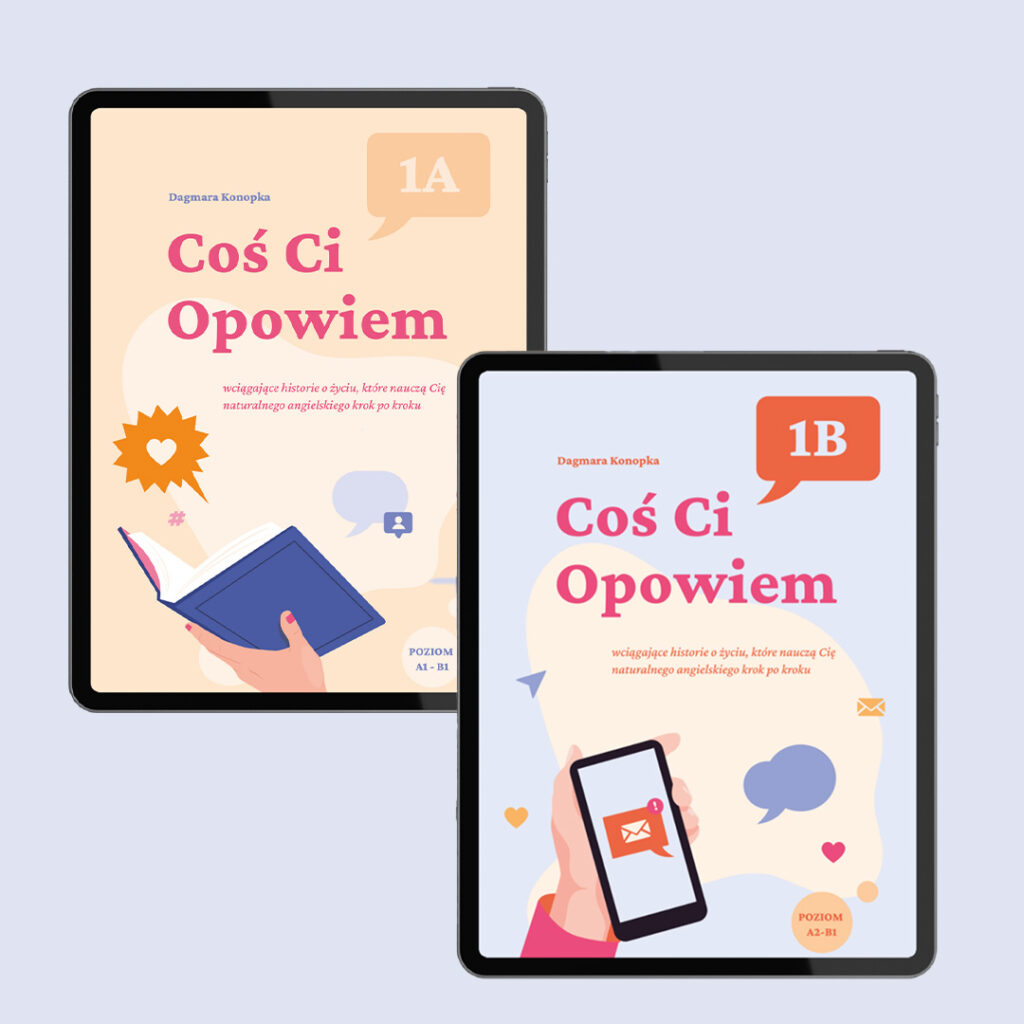 Zestaw Coś Ci Opowiem 1A + 1B to 32 opowiadania, nagrania audio, fiszki i gotowy plan nauki, dzięki któremu krok po kroku zaczniesz mówić po angielsku — naturalnie i bez stresu.